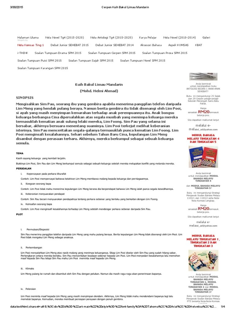 I harvard cerpen kuih bakul limau mandarin sinopsis lim meng yang dihalau oleh bapanya, iaitu lim pool ingin pulang ke rumahnya sempena . Cerpen kuih bakul limau mandarin : Cerpen kuih bakul limau mandarin. Sinopsis mengisahkan sim pau, seorang ibu yang gembira apabila menerima panggilan telefon . Kasih sayang keluarga yang kembali terjalin menjadi tema kepada cerpen kuih bakul limau mandarin karya mohd. Komponen sastera dan novel bm / bahasa melayu.